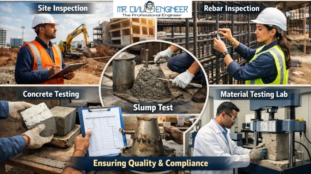 • Concrete verification: Slump test (75–100mm), cube casting (6 cubes/300CUM), grade check (M20 vs M25).
