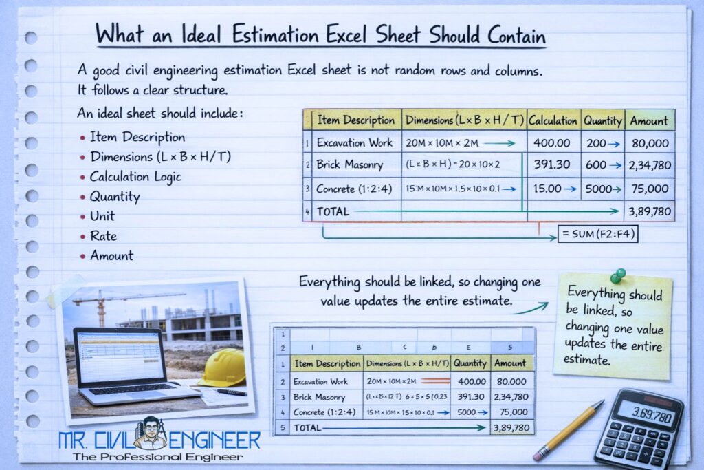 A good civil engineering estimation Excel sheet is not random rows and columns. It follows a clear structure.