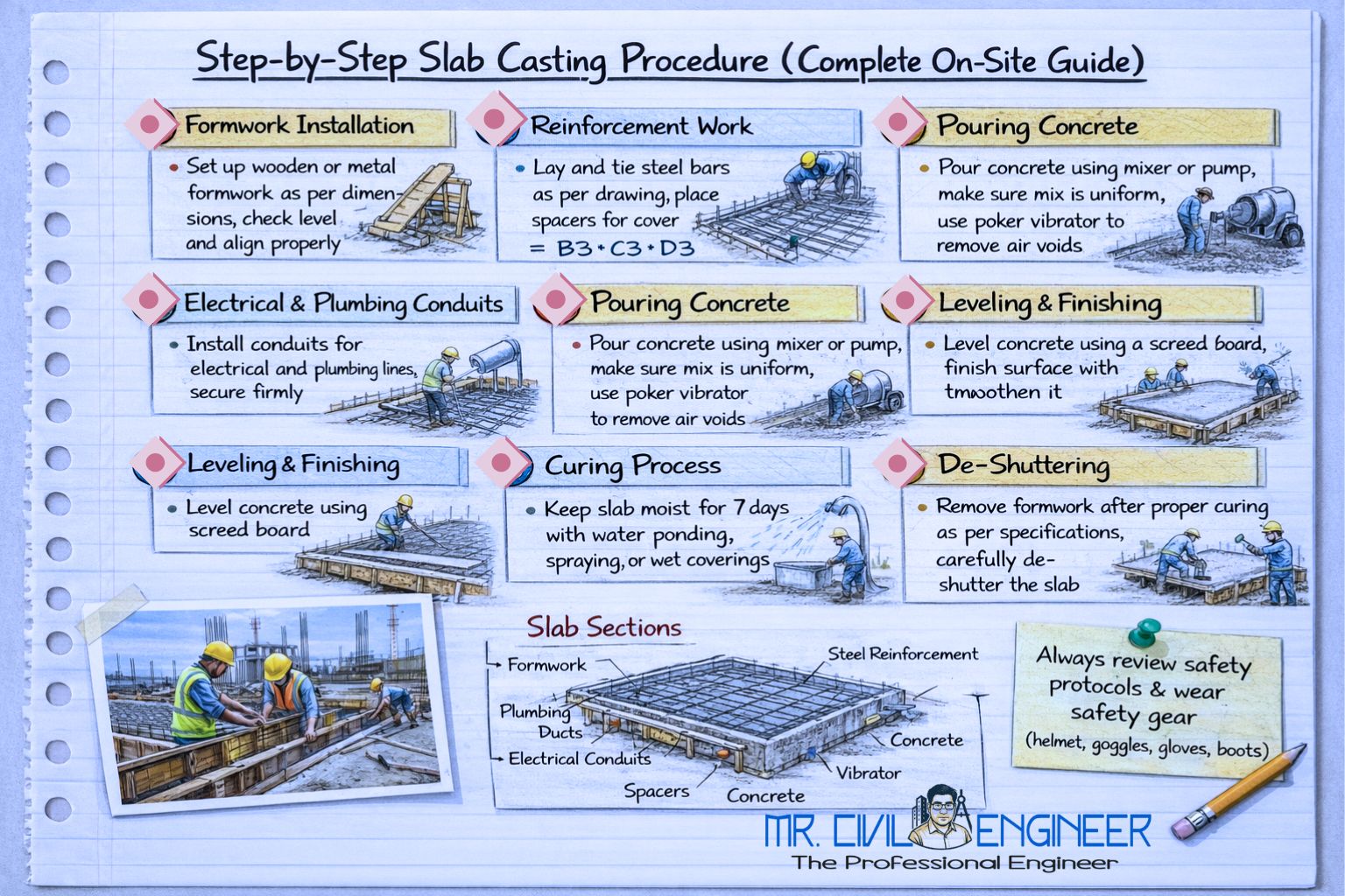 If you’re a civil engineering student, site engineer, or contractor looking for a clear, practical, step-by-step slab casting procedure, this guide is written exactly for you.